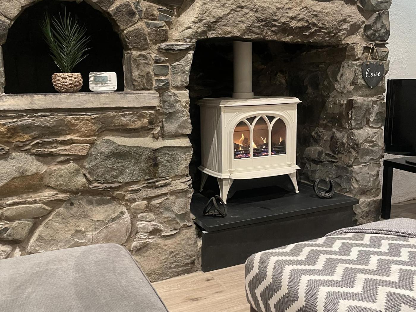 The holiday home features 2 bedrooms, a TV, a fully equipped kitchen with a fridge and a stovetop, a washing machine, and 1 bathroom with a shower. There is also a seating area and a fireplace.