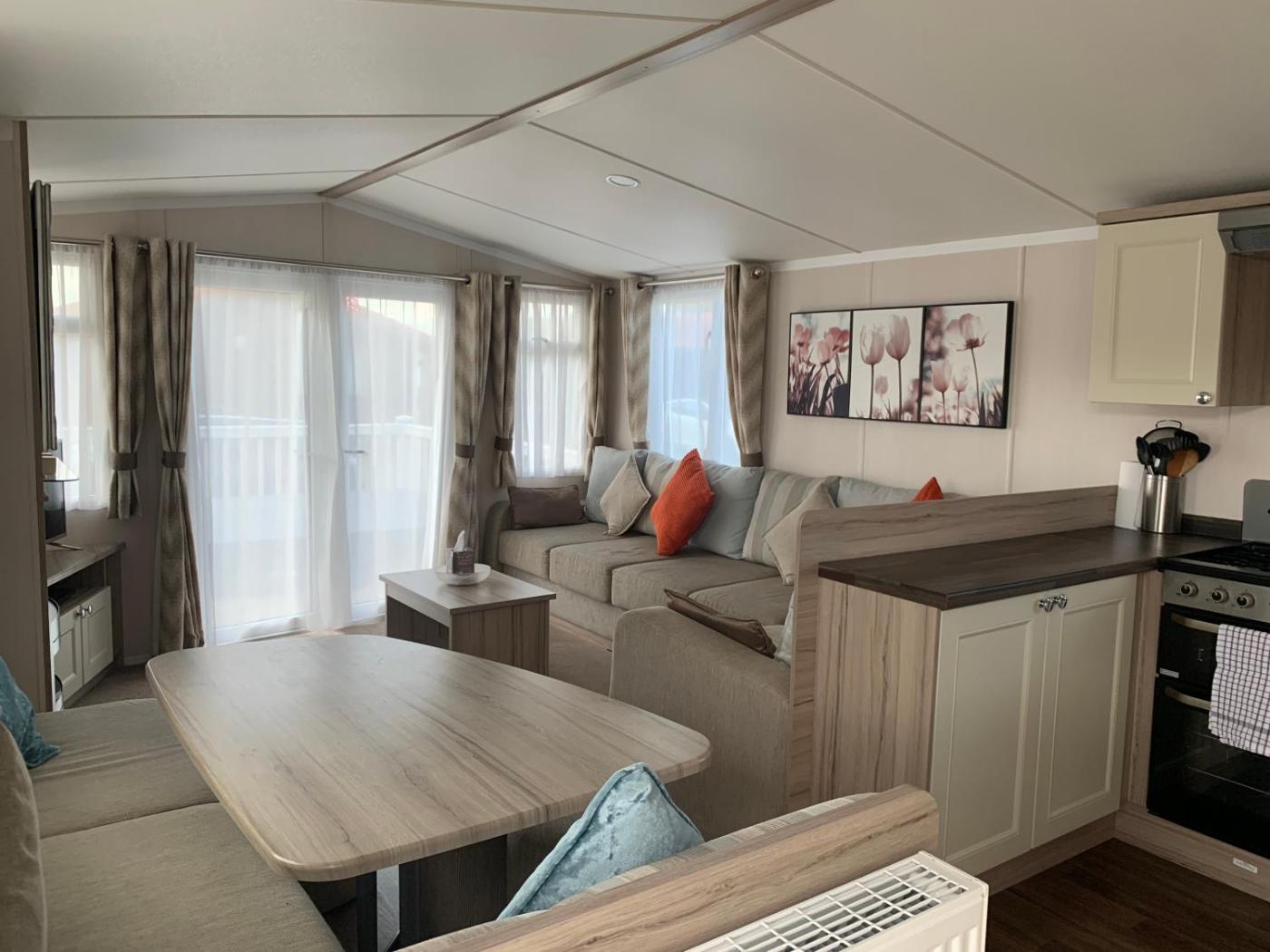Caravan. This mobile home consists of 1 living room, 2 separate bedrooms and 2 bathrooms with a shower and a hairdryer. The mobile home provides a seating area, a dining area, a wardrobe, a flat-screen TV, as well as lake views. The unit offers 4 beds.
