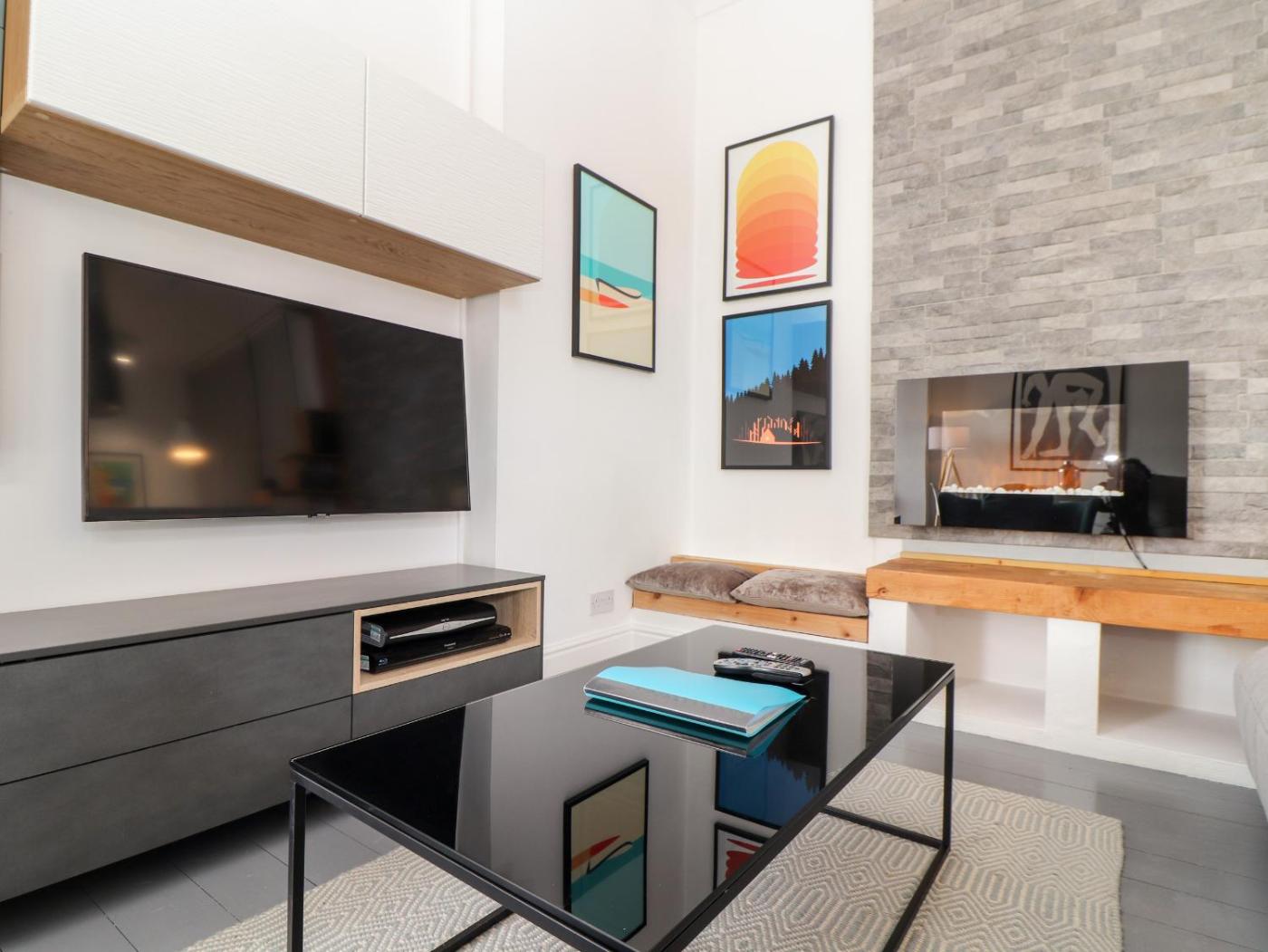The holiday home features 2 bedrooms, a TV, a fully equipped kitchen with a dishwasher and an oven, a washing machine, and 2 bathrooms with a walk-in shower. There is also a seating area and a fireplace.