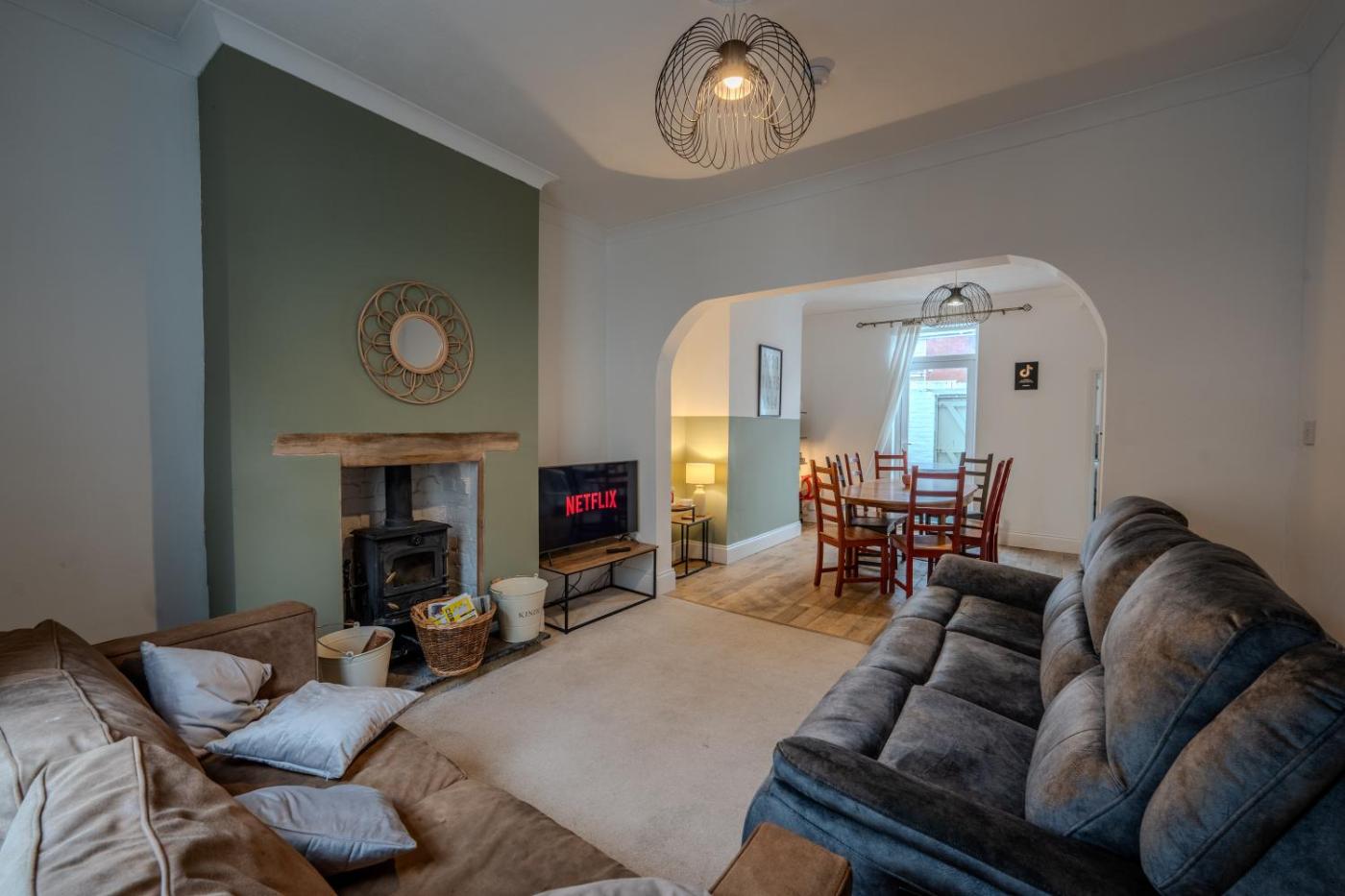 Four-Bedroom House. This holiday homes standout feature is the hot tub. Meals can be prepared in the kitchen, which is fitted with a refrigerator, an oven, a microwave and a toaster. The holiday home offers a washing machine, a seating area, a dining area, an electric kettle and a flat-screen TV. The unit has 2 beds.